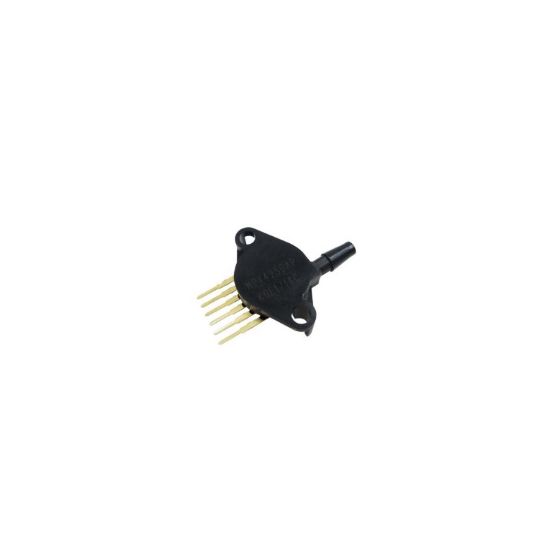MPX4250APEs un sensor de presión de silicio integrado de puerto doble con acondicionamiento de señal en chip, compensación de temperatura y calibrado. El transductor piezorresistivo de la serie MPX5700 es un sensor de presión de silicio monolítico de vanguardia diseñado para una gran variedad de aplicaciones pero especialmente para aquellas que emplean un microcontrolador o microprocesador con entradas A/D.Rango 0 a 700 kPa (0 a 101.5 psi)Voltaje de funcionamiento: 5VVoltaje de salida 0.2 V a 4.7 VError máximo: 2.5% en el rango de temperatura de 0 a 85 °CMedida diferencial2 PuertosSensibilidad: 6.4 mV/kPaTiempo de respuesta: 1 msPresión en P1 debe ser siempre mayor o igual a P2Presión máxima en P1: 2800 kPa (406 psi) (Con P2= 1 Atmósfera)Presión máxima en P2: 500 kPa (72 psi)