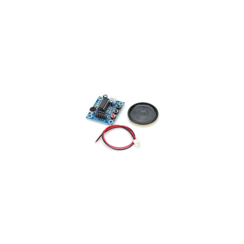 Este módulo es capaz de grabar y reproducir mensajes de hasta 20 segundos de duraciónIncluye bocinaVoltaje de operación: 3V a 5VPuede conectarse directamente a un altavoz de 8 Ohms 0.5W Por default el tiempo de grabación es 10s pero se puede variar de 8s a 20s modificando el valor de resistencia de P2Los botones controlan el método de operación de grabación y reproducción de audioBotón REC: botón de grabación, mantener presionado para grabar y soltar para detenerCuenta con funcipon para reproducir el bucle, lo hace muy útil en aplicaciones de propagandaCon el switch FT se puede configurar para que la voz que detecta el micrófono se reproduzca directamente en el altavozEste módulo puede ser operado de forma manual o mediante el uso de algún microcontroladorDimensiones: 37 mm x 54 mmPeso: 15.6 g