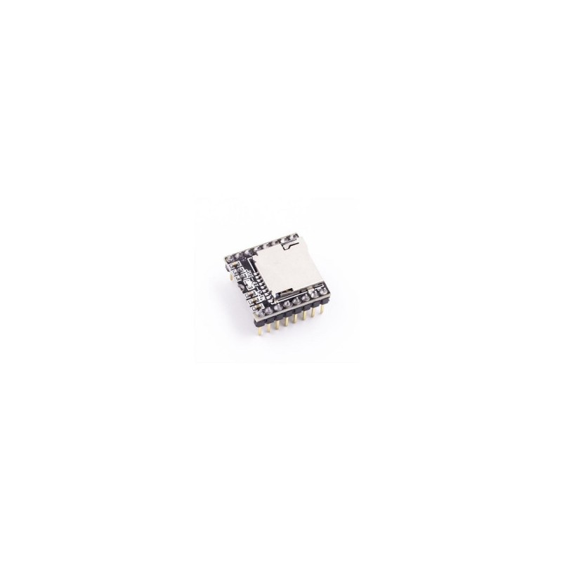 Este módulo es un reproductor MP3 pequeño y de bajo costo con una salida directa a altavoz.Se puede utilizar de manera independiente añadiendo una bateria, un altavoz y pulsadores. O en conjunto con algún microcontrolador por medio de comunicación serie.Voltaje de operación: 3.3V - 5VCapacidad de almacenamiento y reproducción de audioCompatible con tarjetas micro SD de hasta 32GBCompatible con los formatos MP3, WAV, WMATrabaja con formato FAT16 y FAT32Soporta hasta 100 carpetas en la tarjeta SDMáximo 255 canciones en carpeta30 niveles de volumen ajustables6 niveles de ecualización ajustablesDimensiones: 20.5 x 20.2 x 11.5 mm Peso: 3g