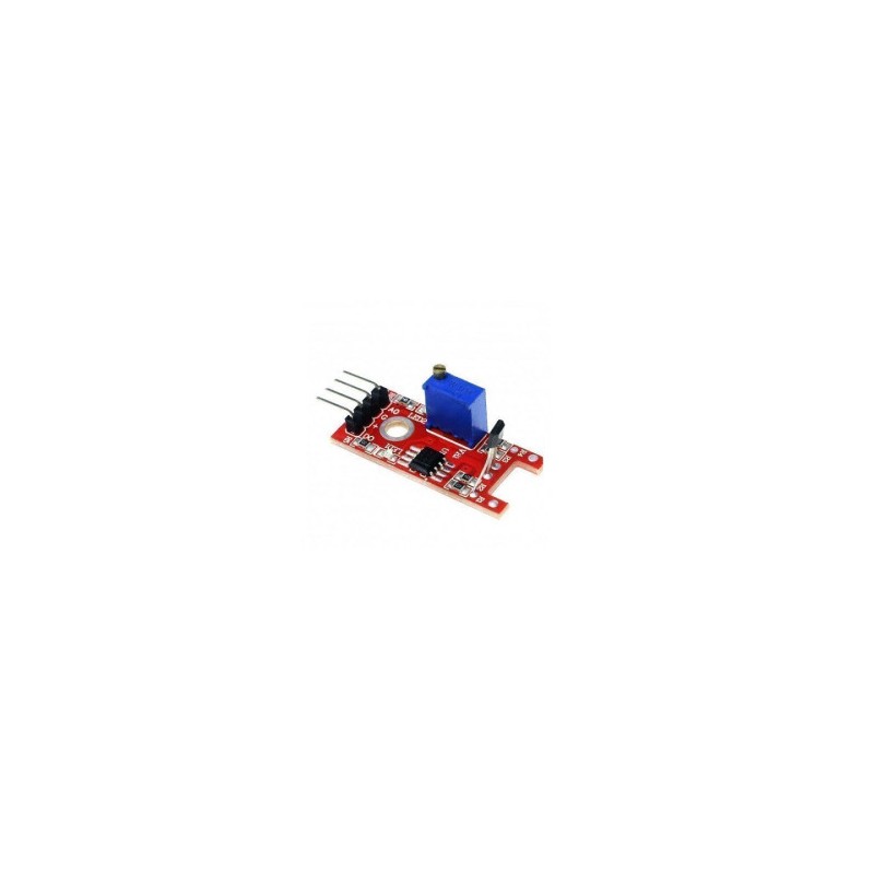 Este módulo permite la medición de campos magnéticos cercanos a él y ofrece una señal de salida analógica y una digital.La salida analógica es proporcional desde 1V para -1000Gauss hasta 4V para 1000Gauss. En caso de no detectar un campo magnético la salida será un voltaje de 2.5V.La salida digital se ajusta mediante el resistor variable integrado en la placa.Su uso más habitual es como encodder magnético para medir la velocidad de giro de un motor.Voltaje de operación: 4.5V - 6VSensitividad: 1.4mV/GaussDimensiones: 43 x 15 x 13 mm