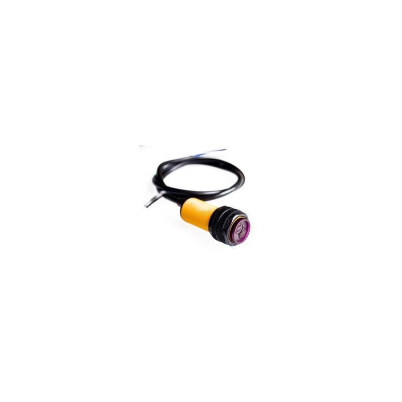 Este sensor óptico se basa en el principio de reflexión y está diseñado para la detección de presencia de objetos.Tiene un rango de detección de hasta 80 cm y una salida digital en estado bajo cuando detecta un objeto y en estado alto si no hay presencia de alguno.Este sensor no emite una señal en funión de la distancia pero cuenta con un potenciómetro que permite regular la distancia de detección y un led que se enciende al detectar un objeto, haciendo que su calibración sea muy sencilla.Voltaje de Operación: 5V DCCorriente de trabajo: 20mA máx.Corriente de salida (carga): 100mA máx.Rango de detección: 3cm a 80cmDimensiones: D18mm*L50mmCuerpo roscado de plásticoMaterial carcasa: plásticoLongitud del cable: 80cmIndicador de detección: LED rojoTemperatura de trabajo: -25 a 70°CPeso: 42 gr.